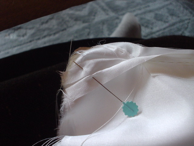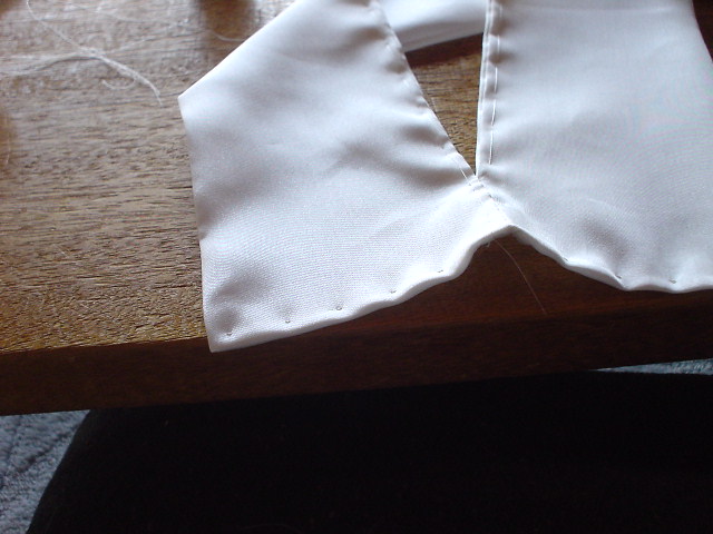 片側を写真の様に入れ、袖口下のとめと同じ止め方をし、右袖は裏を左袖は表を見ながら縫う。